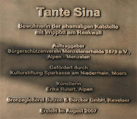 Am 26.08.2007 wurde vor dem Schützenhaus „Am Wippött“ in Menzelen-West die Bronzestatue der „Tante Sina“ enthüllt. Fast auf den Tag genau war es her, dass die alte Katstelle von Gesina van Leuck – Tante Sina – am Reckwall in Menzelen-West abbrannte.