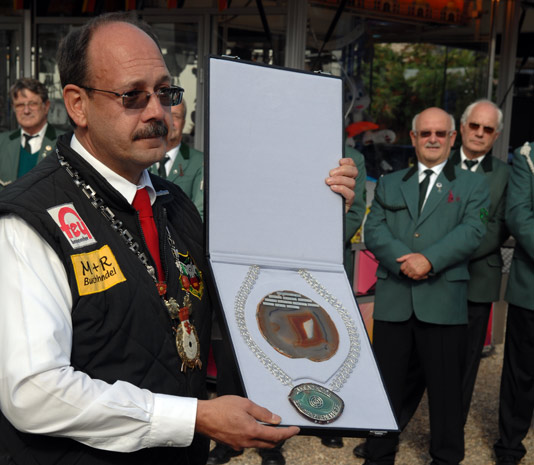 Im Laufe der folgenden Jahre wurde dann das Absperrband gegen eine rot-weiße Absperrkette ersetzt. 2004 wurde durch den damals amtierenden JUSCH-König Michael Laakmann eine vergoldete Kette mit Türklingelschildern gestiftet. Im letzten Jahr auf unserem Schützenfest im Oktober wurde diese dann überraschend „an den Nagel gehängt“. Nachdem der Präsident des SV Idar-Oberstein seine Gastrede gehalten hatte, ergriff unser JUSCH-König Jens Parbel das Wort. Er überreichte den Jungschützenvertretern eine Hand geschmiedete Königskette aus echtem Silber... (Fotos: Ralf van Royen)